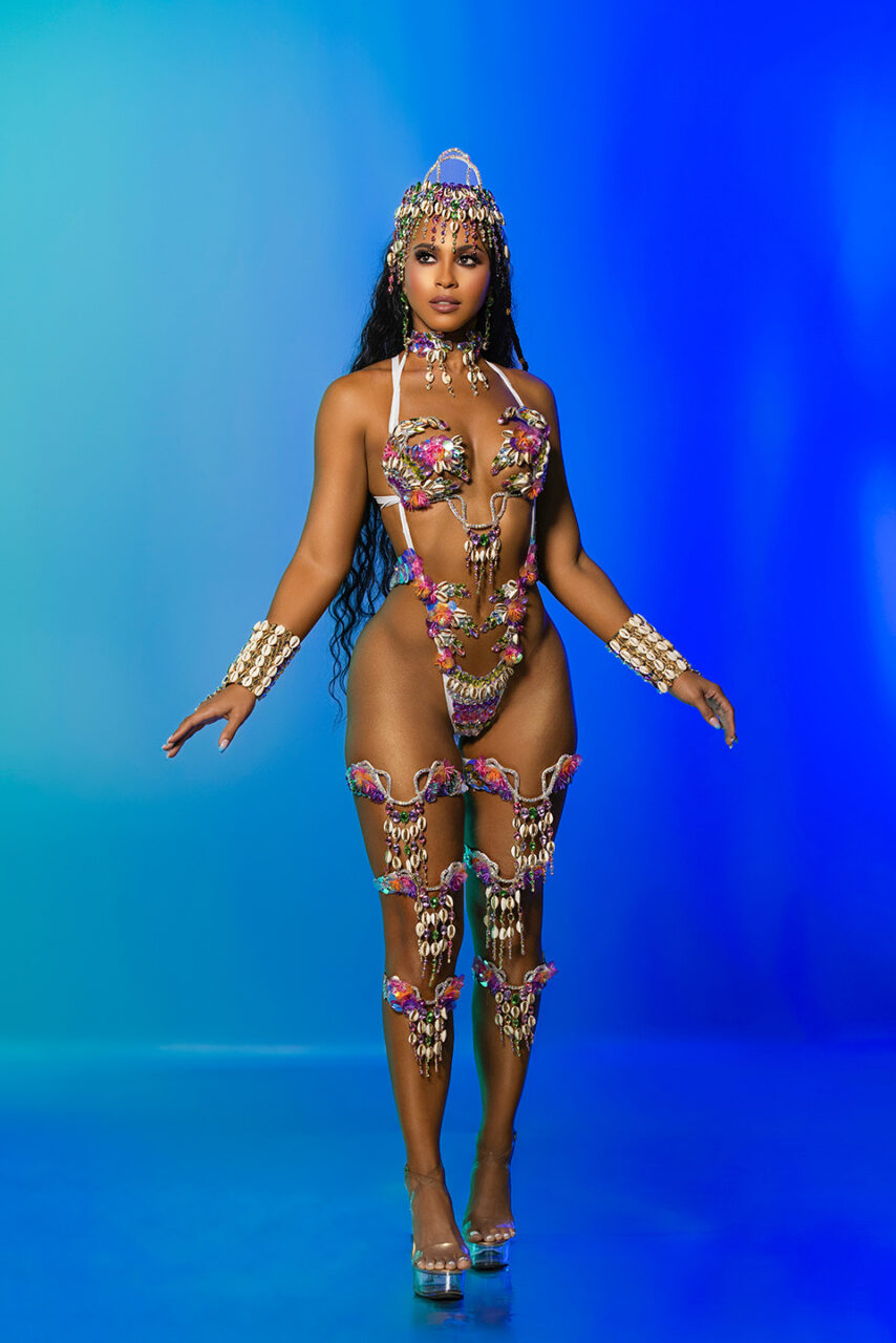 Costume Includes: Headpiece, neckpiece, wrists, bra, bottom, upper legs, mid legs, lower legs