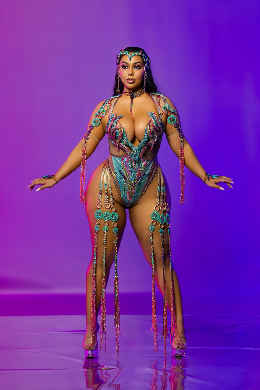 Costume Includes: Headpiece, neckpiece, upper arms, wrists, bra, bottom and leg pieces.