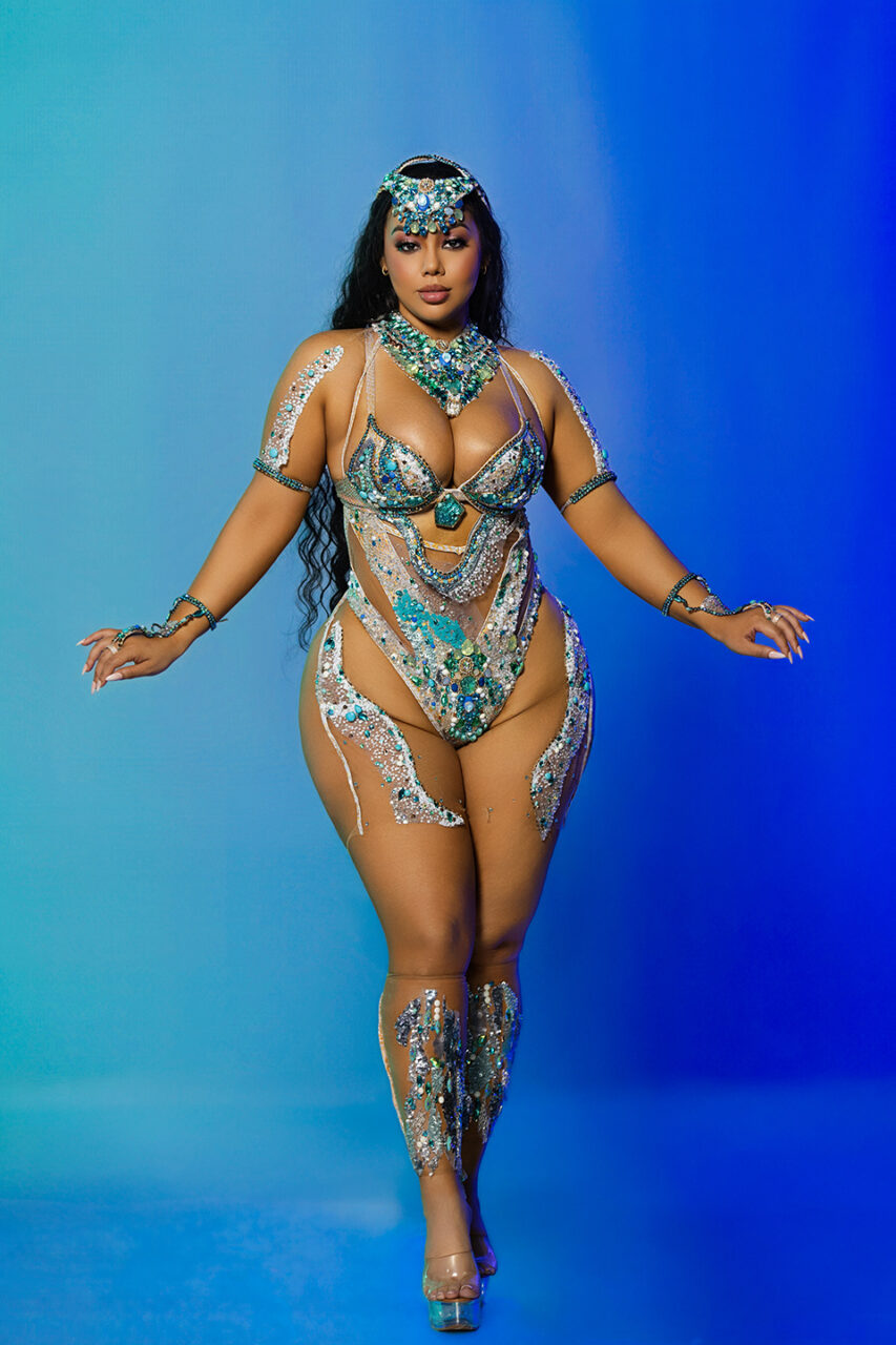 Costume Includes: Headpiece, neckpiece, upper arms, wrists, bra, bottom piece, upper legs & lower legs.